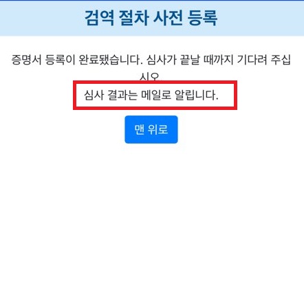 몇 시간 지나면 '제대로 된' 증명서인 경우 바로 검역 승인 메일이 옵니다. 그러면 아래와 같이 심사 완료된 화면을 확인할 수 있습니다.