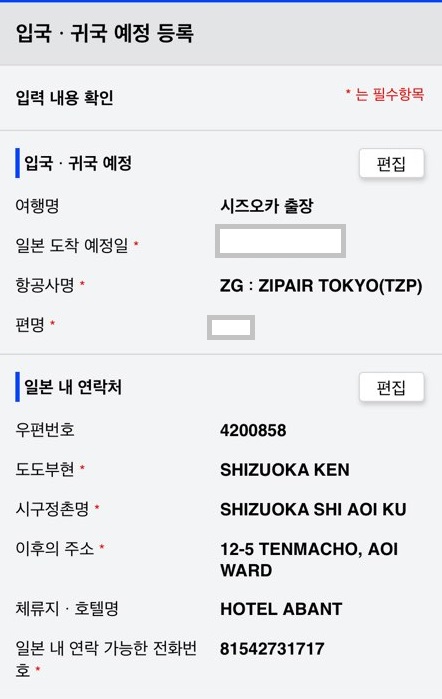 일본 여행을 하시는 분들이라면 본인이 묵는 숙소 주소와 전화번호를 미리 알아두셨다가 등록하시는 것을 추천합니다.