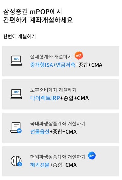 삼성증권에서 ISA계좌를 개설하기 위해서는 종합계좌 또는 CMA 계좌가 있어야 합니다. 그래야 입금을 한 후 본인이 원하는 종목에 투자가 가능하기 때문이지요~