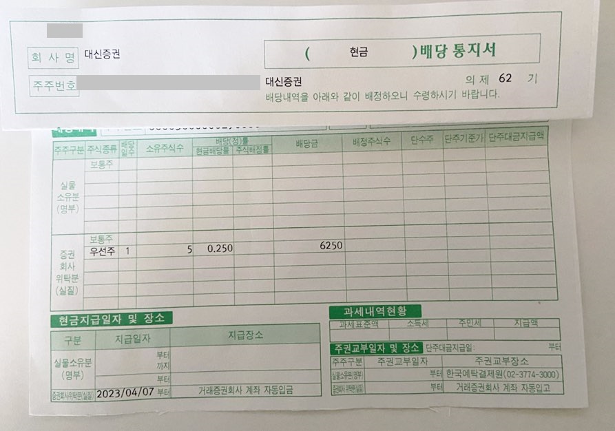 대신증권의 배당금 총액은 약 8,000억 원 수준으로 시가 배당률이 8.15%면 정말 고배당이라고 할 수 있습니다. 그래서 제가 5주밖에 보유하지 않았지만 6,250원을 받을 수 있는 것이지요~ 저는 우선주 1로 1,250원으로 책정되었습니다.
