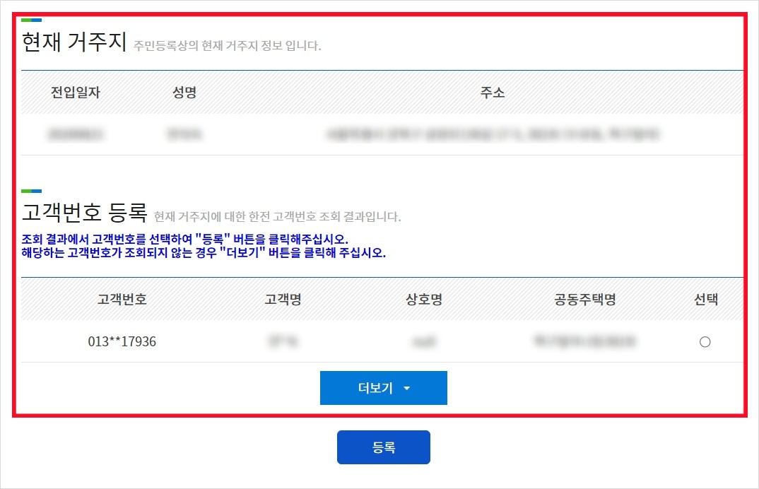 본인의 주민등록상 거주지 정보와 한전 고객번호 조회가 자동으로 됩니다. 빌라인 경우 고객명과 동, 호수를 정확하게 확인하신 후 선택을 하시면 됩니다.