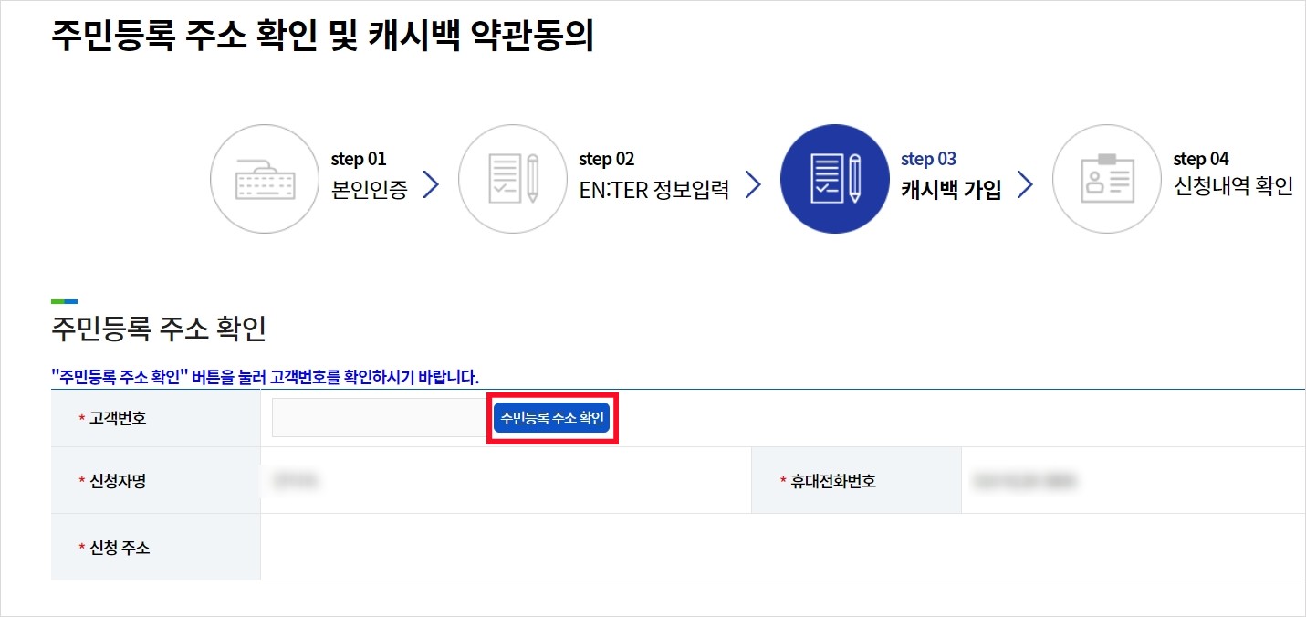 유의사항: 캐시백 신청장소의 주소와 신청자의 주민등록표상 주소가 일치하는 경우에만 신청이 가능합니다.