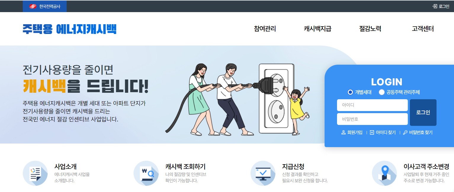 보시면 '주택용 에너지캐시백'이라는 이름으로 홈페이지를 접속할 수 있습니다. 전기사용량을 줄이면 '캐시백'을 드립니다!라는 내용으로 에너지 절감 인센티브 사업을 안내하고 있습니다.
