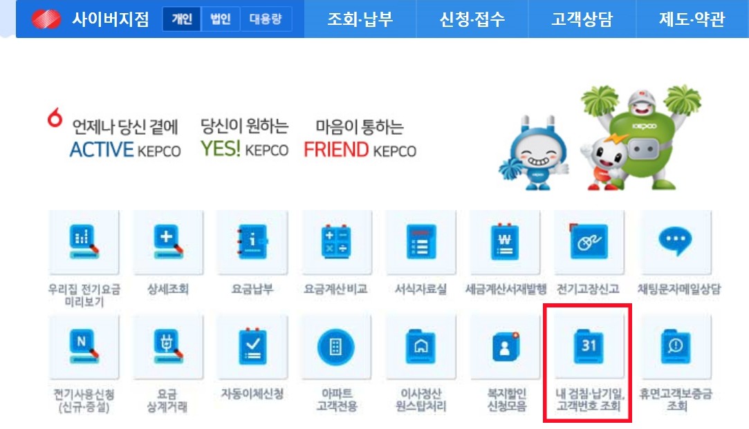 ※ 고객번호가 조회되지 않는 경우 [고객번호 직접 입력하기] 통해 입력하면 됩니다. 고객번호를 모르시는 경우 한전 고객센터(☎123)로 문의하시거나, 한전사이버지점을 통해 조회가 가능합니다.