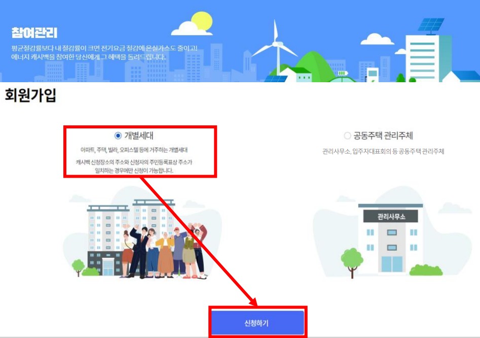 이 글을 보시는 분들은 대부분 아파트, 주택, 빌라, 오피스텔 등에 거주하는 개별세대일 것입니다. 회원가입 종류에서 [개볈세대]를 선택하시고 가입하시면 됩니다.
