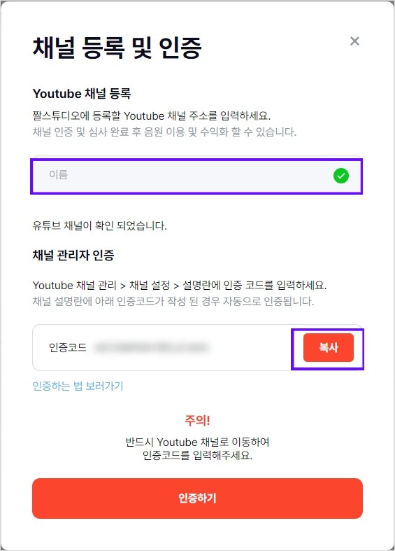 채널 등록 및 인증 화면이 나오면 '내 채널 링크(주소)'를 입력합니다.