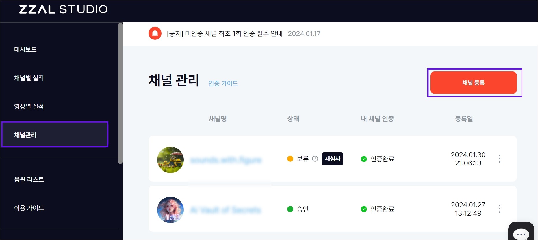 채널 2개 모두 인증은 바로 완료되었지만, 첫 번째는 '보류' 상태이고 두 번째는 '승인'상태입니다.