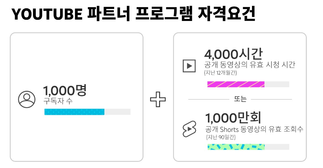 1. 지난 12개월간 공개 동영상의 유효 시청 시간이 4,000시간 이상이고 구독자가 1,000명인 경우 또는