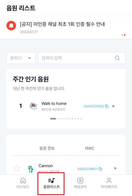 저는 '바다의 속삭임'이란 음원을 선택해 옆에 있는 ISRC 코드를 복사해 두었습니다.