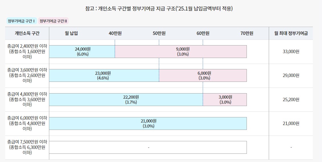 개인소득 구간별 정부기여금 지급 구조가 1월 납입금액부터 적용되니 아래 이미지도 참고하시기 바랍니다.