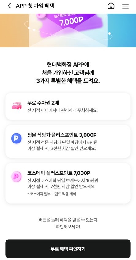 현재 현대백화점 APP(앱)에서 이벤트 중인데요. 2025년 1월 1일부터 12월 31일까지 1년 동안 진행된다고 하니 필요하실 때 적극 활용하시면 될 듯싶습니다.