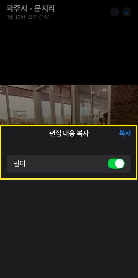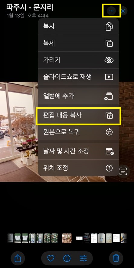 편집을 완료한 사진의 오른쪽 상단에 점 세 개 (···)를 클릭하면 아래에 [편집내용 복사] 메뉴가 있습니다.