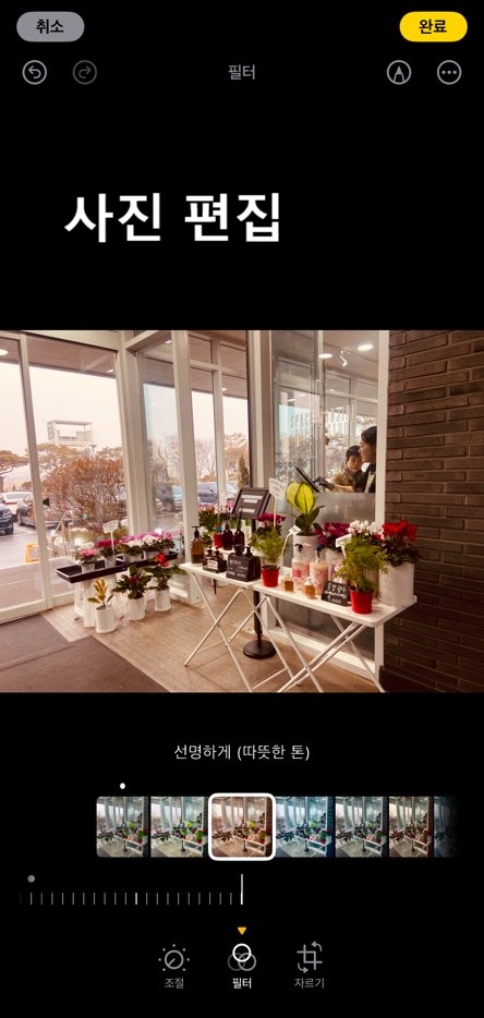 아이폰 사진을 편집하는 메뉴는 크게 조절, 필터, 자르기가 있습니다.