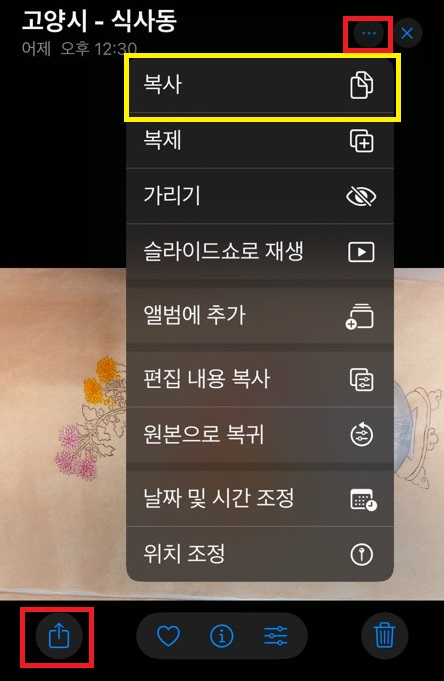 상단의 점 세 개(...)를 사용하시거나 하단 아래 공유하기를 선택하셔도 무방합니다.