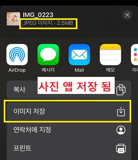 파일 자체를 공유하셔도 되고, 아래 이미지 저장을 누르시면 사진앱에도 저장됩니다.