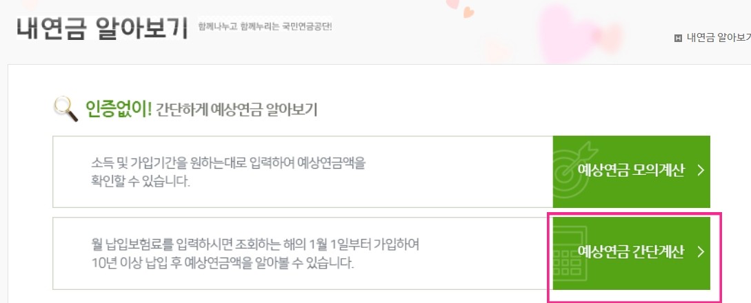 위 링크를 통해 접속하시면 다음과 같은 웹페이지가 나옵니다. 그러면 본인이 월 내는 연금액을 입력하시면 예상수령액이 자동으로 계산됩니다.