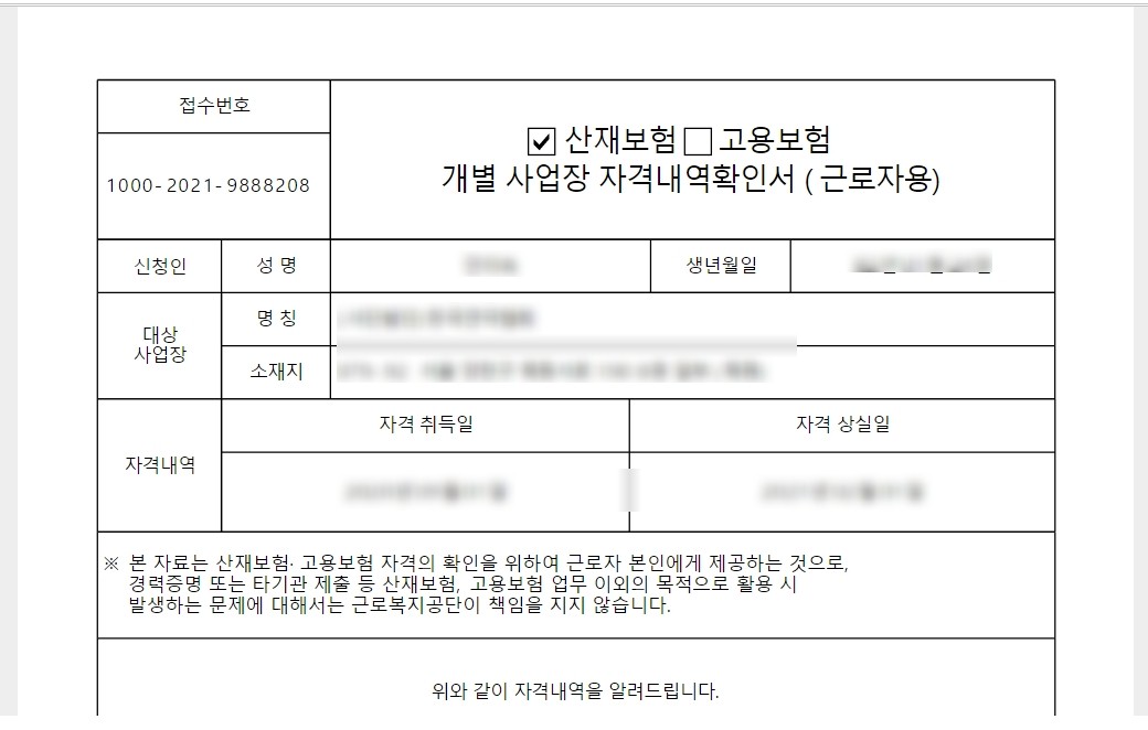 - 본 자료는 고용·산재보험 자격의 확인을 위하여 본인에게 제공하는 것으로, 경력증명 또는 타기관 제출 등