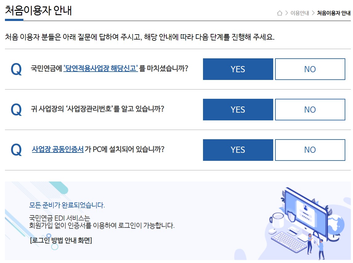 국민연금 EDI 서비스를 이용하시려면 다음 조건에 맞아야 회원가입 없이 로그인이 가능하고 서비스 이용이 가능합니다.