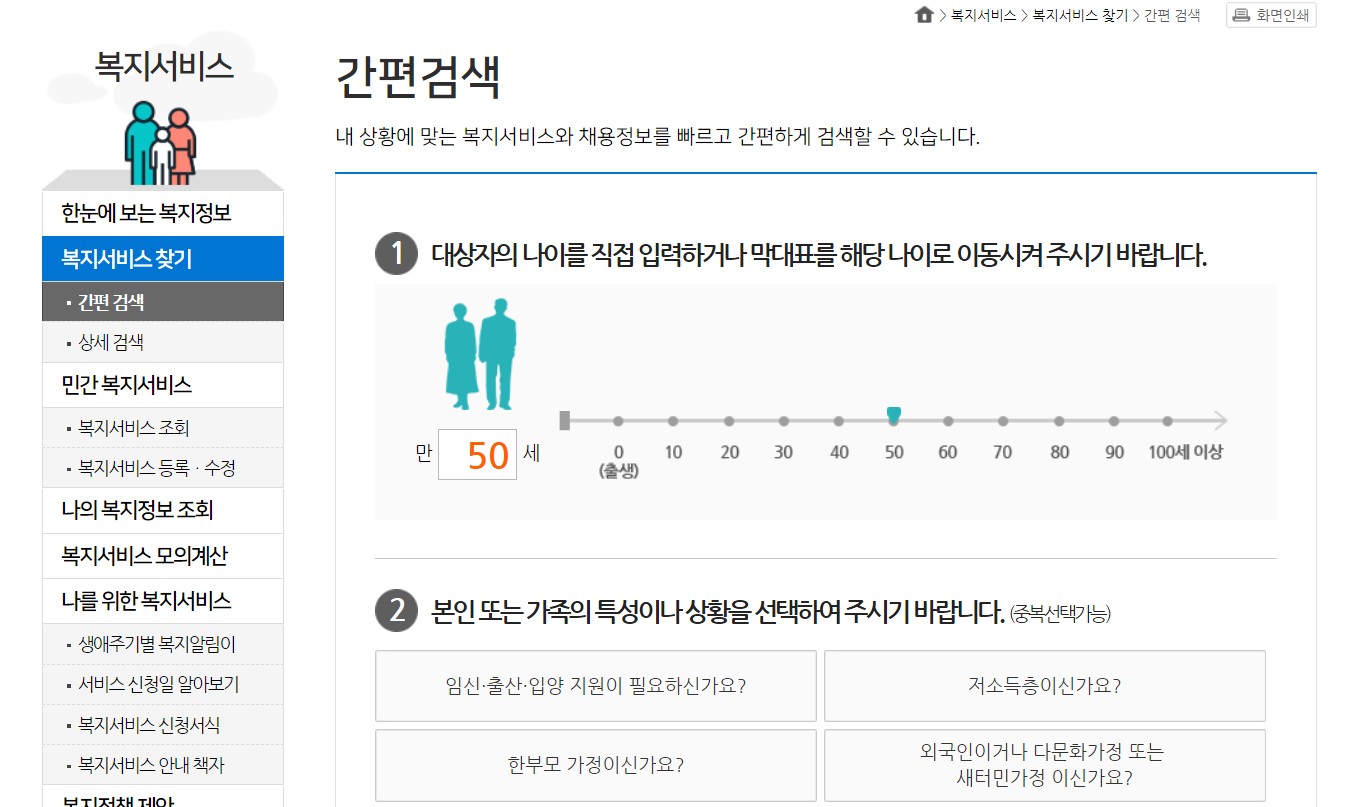 내 상황에 맞는 복지 서비스와 채용정보를 빠르게 검색할 수 있습니다. 간편 검색 화면에서 연령, 가족특성, 필요한 지원 등 간단한 항목 선택만으로도 내가 받을 수 있는 복지서비스를 찾아볼 수 있습니다.