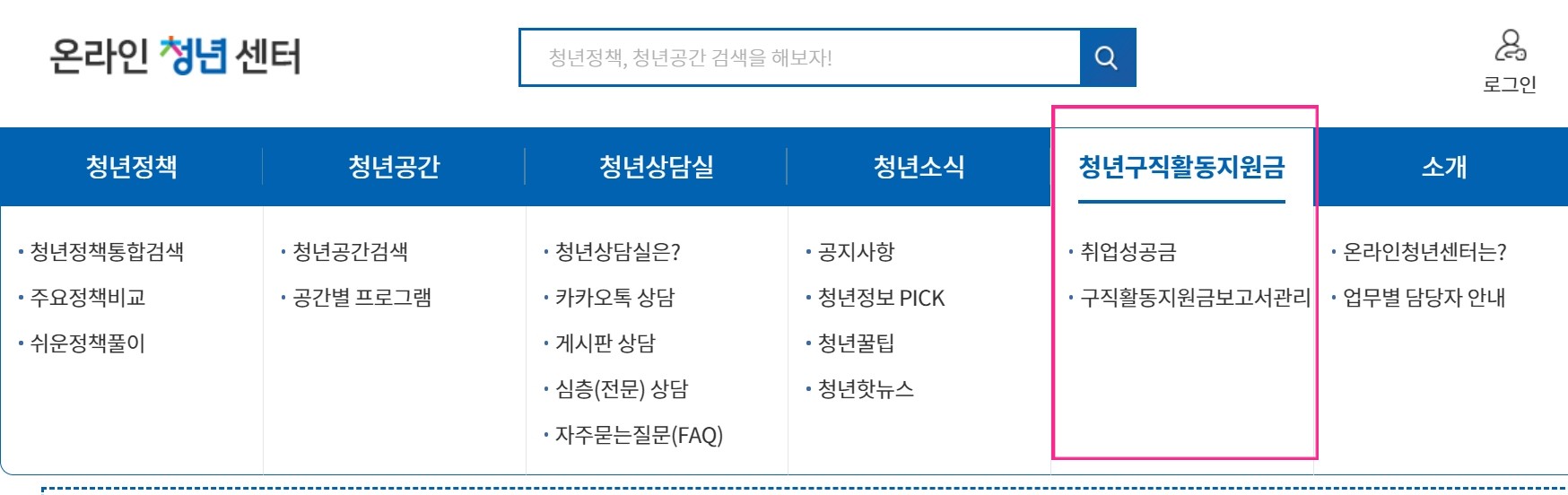 온라인 청년센터 상단 메뉴 중 '청년 구직활동 지원금' 메뉴를 택하시면 됩니다.